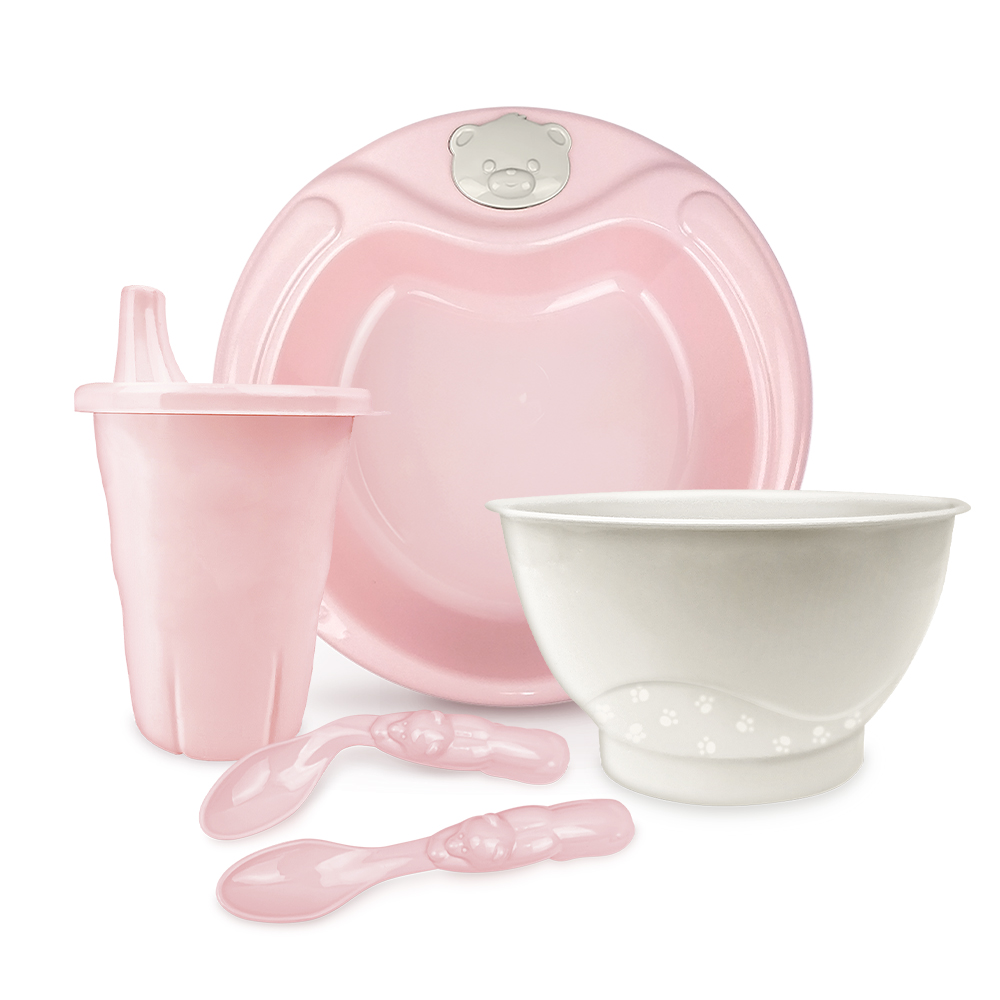 - KIT ALIMENTACAO INFANTIL ( CONTEM: 1 PRATO, 1 TIGELA, 1 COPO COM TAMPA E 2 COLHERES) ROSA CLARO